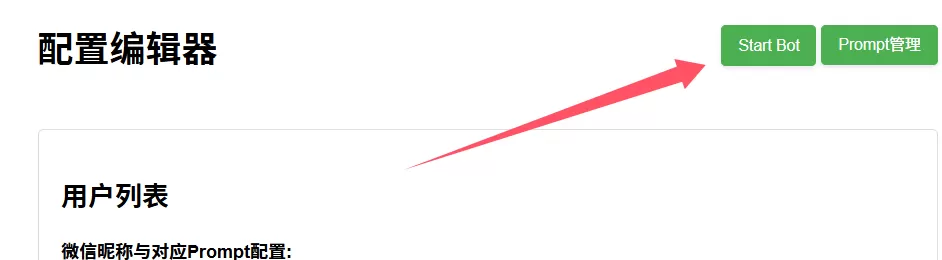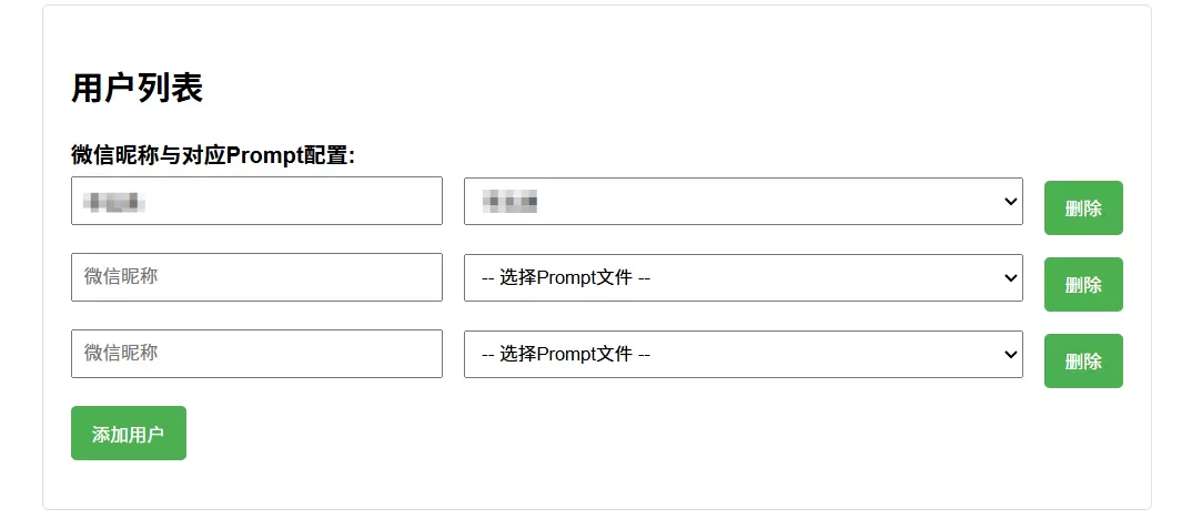 在用户列表内填入机器人需要聊天的对象,注意此程序不能同时和多人同时聊天,只会一个一个处理消息,每个对象都要选择一个Prompt,这个也是机器人的重要配置之一。