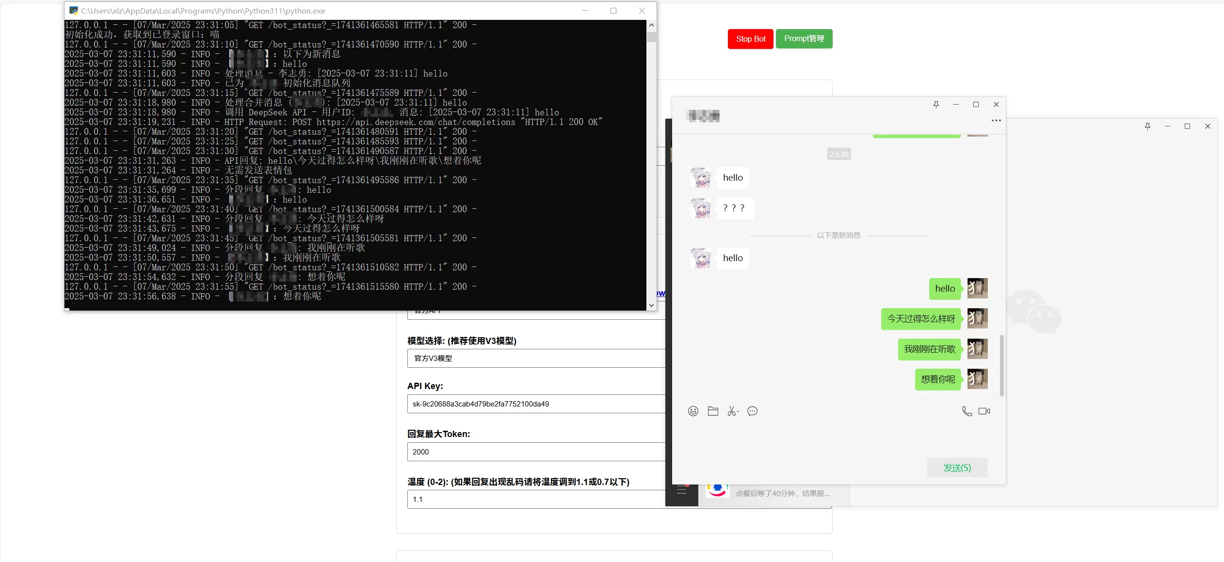 这是运行成功的截图,注意每次回复都需要延迟,这是正常现象,然后我们就能可自己的ai女友聊天了qwq。